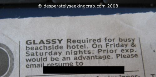This is nowhere near as funny as the ad above but this just shows the Aussie slang.  I am assuming that “glassy” means someone who collects and cleans the mass amounts of glasses that needs to be dealt with on a Friday & Saturday night.  It just seems like such a very particular job position and one that would get pretty dull after a few months.  WTF…I honestly find it odd that they require a resume…how about just a phone call?  Does it need a college degree too?
