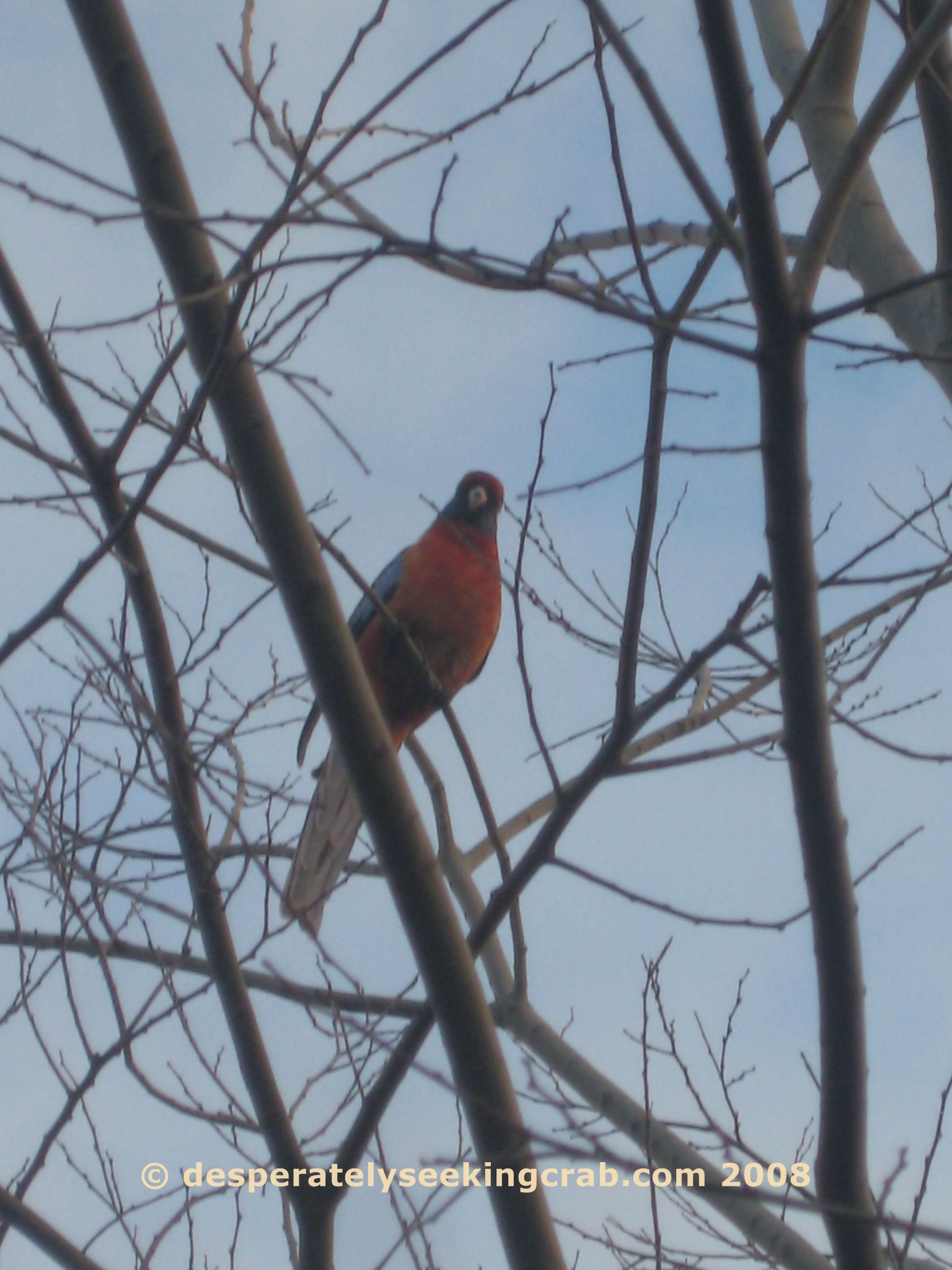 Anyway, here is another parrot – the Adelaide Rosella, that was in my garden over the weekend while I was trying to plant bok choy, sweet peas, green onions and peonies. Adelaide Rosellas are a cross between Yellow Rosellas and Crimson Rosellas (bright red & gorgeous). This guy was eating the red berries in the tree next to my fence.