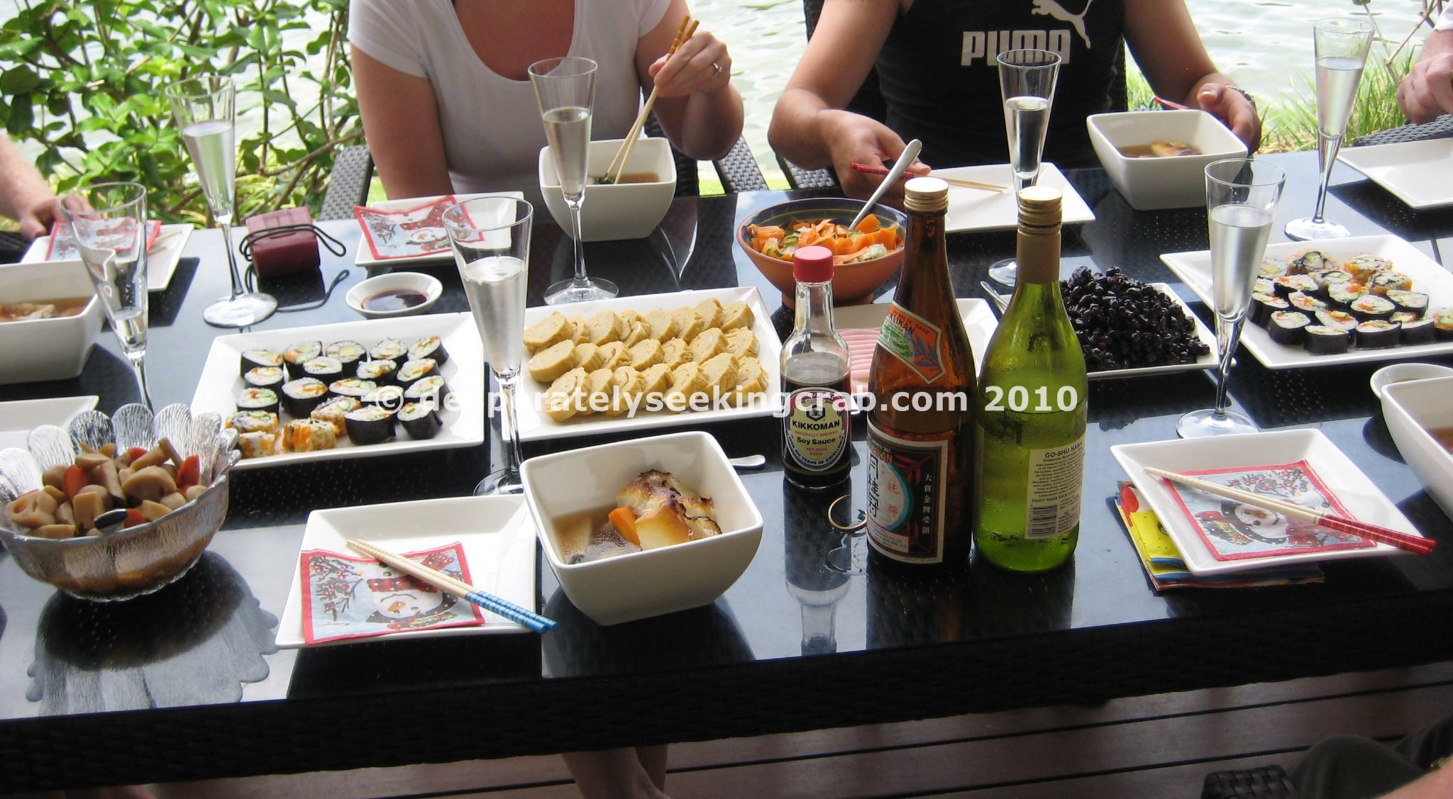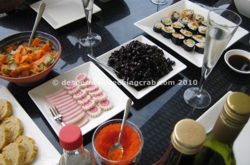 Although the meal was not totally traditional, it turned out pretty well despite a few hicks – forgot dashi, sushi rolls were a bit small, rice for sushi was very sloppy (had to make it twice – over the stove with gas), and rolled egg was a bit overcooked. For the ozoni, I grilled the mochi on a grill rack instead of the traditional grill used in Japan and it did a great job. The kuromame (black soy beans) were made mostly out of my instinct and memory of what it should taste like but I had no idea they’d take nearly five hours to cook! I also think that they were the most challenging item as most people couldn’t work out whether the beans were for dessert or to be eaten with the meal. I guess it’s sort of like eating candied yams at Thanksgiving – many people who encounter it the first time think that it is a dessert and find it strange to be eaten alongside all the other savoury stuff.