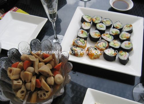 L to R: datemaki (egg), namasu (pickled veg - didn't have daikon available), kamaboko (pink fish cakes), kuromame (black sweet beans), california roll.