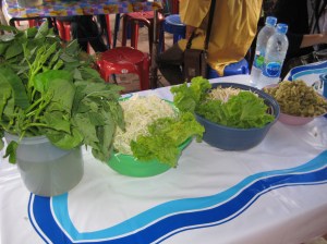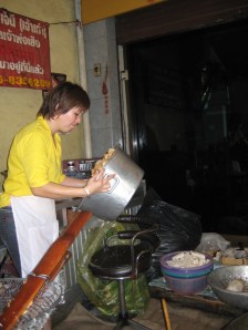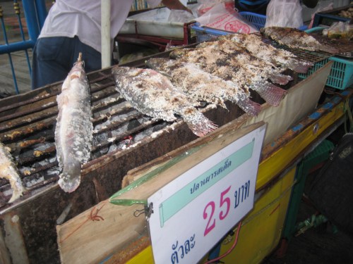 Whenever Andrew Zimmerman or Anthony Bourdain go on their tours of Asia, you always see them eating some type of insect so I was really hoping to find some form of cooked insect in Thailand. I was lucky to find this woman, who had a stand on one edge of the Chatuchak Weekend Market in Bangkok and I was quite excited that the variety was so immense! From what I can make out, there are silkworm cocoons, grasshoppers, crickets, and some beetle larvae in the first photo. In the second photo, in the foreground, are the most gigantic cockroaches I’ve ever seen and behind them, looks like some type of small bird (think it’s a chicken that’s not quite mature yet)!! At first I thought that those fried birds were fried bats…all of the items were deep-fried to a golden crisp and nicely garnished with green stuff (pretty sure it’s green onions).
