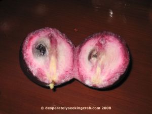I did come across two fruits that I was not that familiar with: the star apple and a yellow passionfruit of unknown variety. Star Apples are said to be originally from the West Indies, Haiti to be exact, and is a very dark purple fruit with a thin skin. When the fruit is cut crosswise, a star pattern is seen but I didn’t really realize this so when I cut the fruit to take a photo, I cut it lengthwise. The pulp is a milky lavender color and is creamy and tastes like a watered-down, less sweet version of a custard apple (cherimoya). I don’t know, I was so excited with the way it looked that I was expecting so much more with the flavor and it was a bit disappointing.